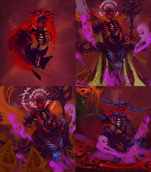 土日を潰して描きあげたよ!デカイ!CMYK!普段描かないものばかり!の3拍子で難しかったけど、すごくいい経験になりましたん! 亡霊が怖すぎたんじゃないかとちょっと心配でござる。 ちなみにこれが一番最初に描いたラフたち!最初は下半身までしっかり描くつもりだったけど、骸骨だと顔が寂しいから、インパクト狙いでぐっとアップにしたんだっけなあ~。