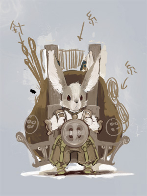 最初の段階ではでっかいリュックに裁縫道具をつめて、と考えていたのですけれど、多少強引なくらい裁縫裁縫していたほうがいいと思ってミシンとチェンジ!ちなみにモデルは、近所の保育園で放し飼いにされてるうさぎちゃん。