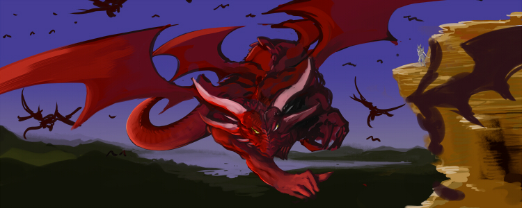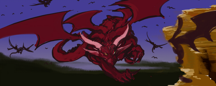 ちょっと描きこみした状態。全体的に鮮やかすぎる気がするけど、レッドドラゴンだしぎらぎらしてていいのかなぁ?あとはドラゴンの質感をなんとかして(ならないかも…)、背景を描きこみして、完成の予定です!