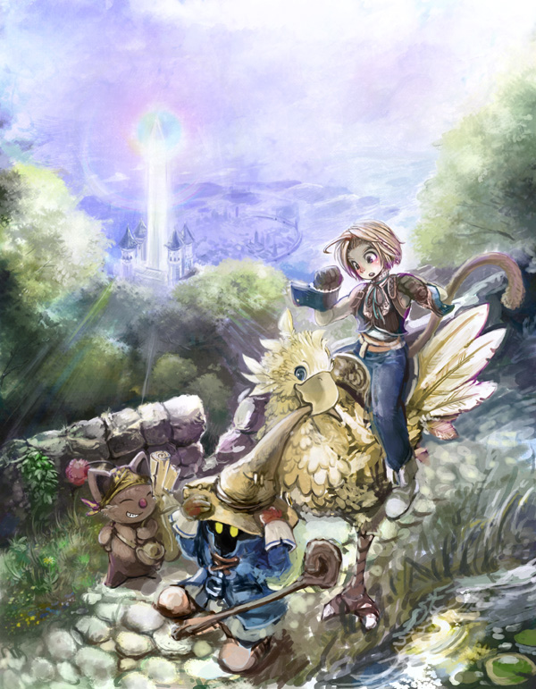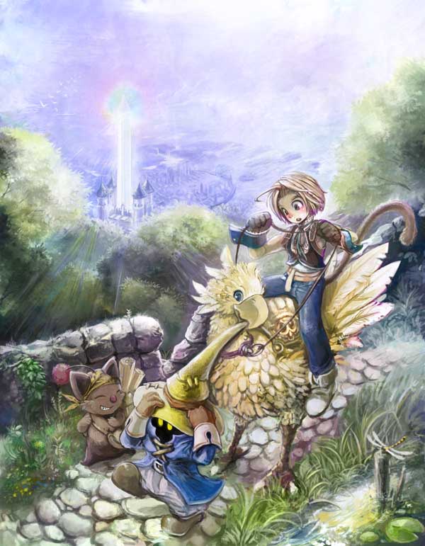 ラフではチョコボにコートをくわえられてぶらーんとぶらさがっていたのだけど、UFOキャッチャーのごとく吊るされるのはビビのキャラとしてよろしくない気がしてやめました。代わりに袖を引っ張らせてみたりしたものの、かわいさ不足だったし、最終的に帽子を引っ張られて慌てて両手でガードする、って感じに落ち着きました。ゲーム中でも帽子を両手でくいくいっと直すビビのしぐさは極上のかわいさだしねーー!!