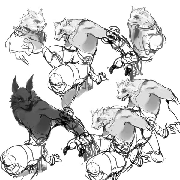 全体のラフです、完成のイメージをつかむため&テンションアップのために、顔だけ描き込みをしています。今回は、隙間を無くすくらいみっちり模様を描くのが1つの目標です。最初は体型にメリハリをつけるために、エヴァンゲリオンみたいな腹部にする予定でした。