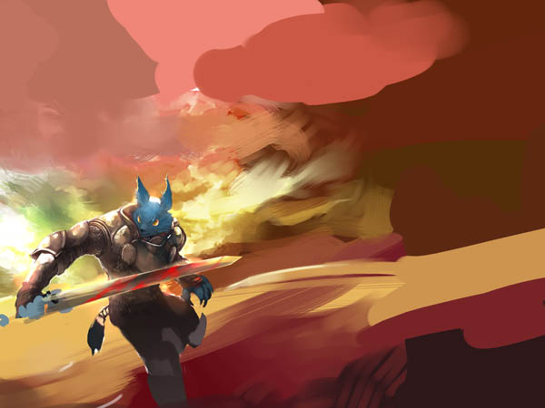 細部のデザインをその場の勢いで考えつつ、描き込みをしていきます。今回はほとんどsaiだけで描いたような気がします。魔法陣のような光はレイヤー機能をチョチョイといじって、オーバーレイ+加算(発光)でありきたりなピカピカ具合です。
